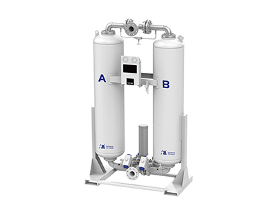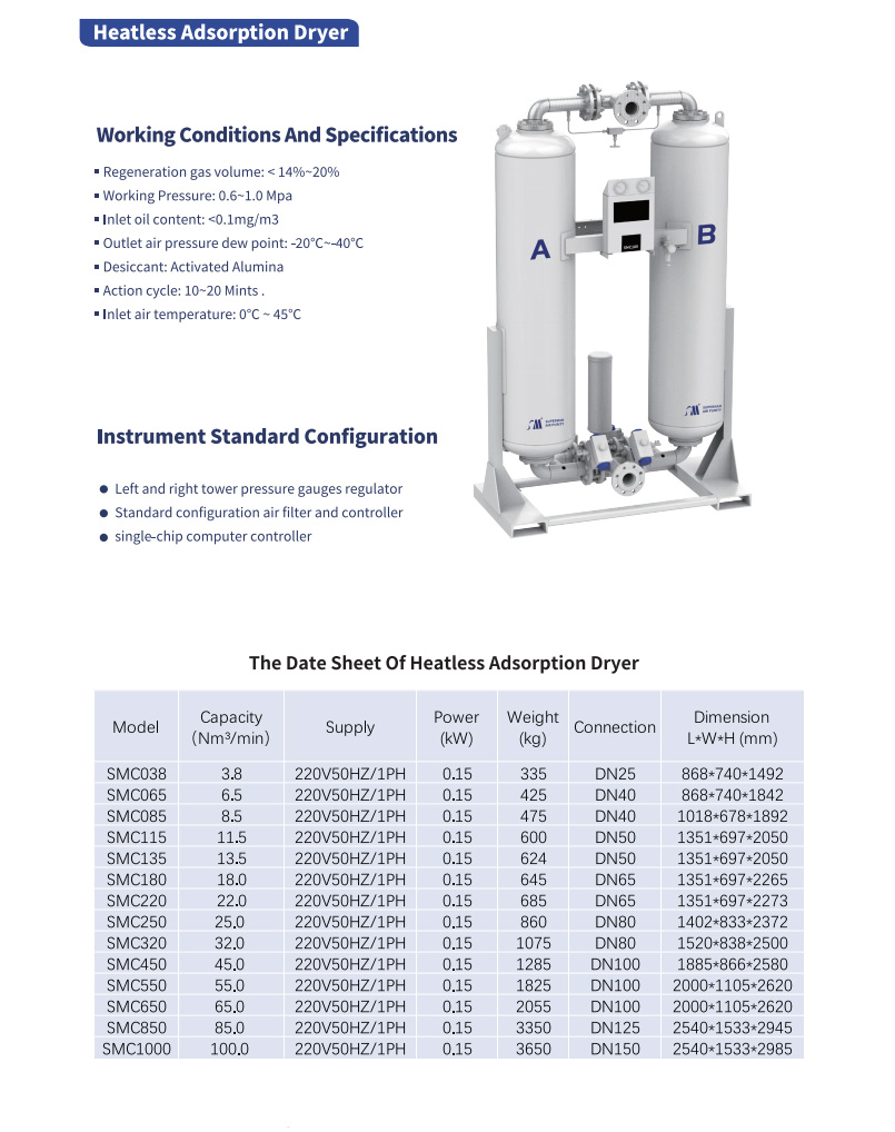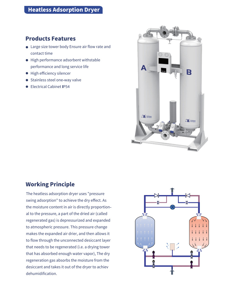 The heatless adsorption dryer uses "pressureswing adsorption"to achieve the dry effect.Asthe moisture content in air is directly proportion-al to the pressure,a part of the dried air (calledregenerated gas)is depressurized and expandedto atmospheric pressure.This pressure changemakes the expanded air drier,and then allows itto flow through the unconnected desiccant layerthat needs to be regenerated (i.e.a drying towerthat has absorbed enough water vapor),The dryregeneration gas absorbs the moisture from thedesiccant and takes it out of the dryer to achiev