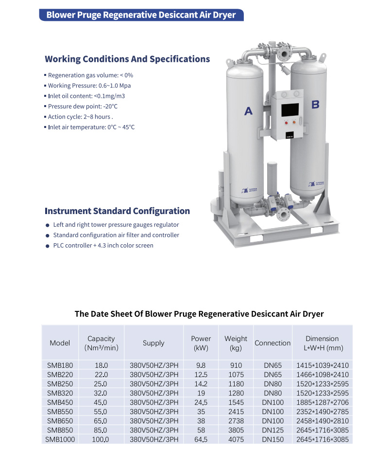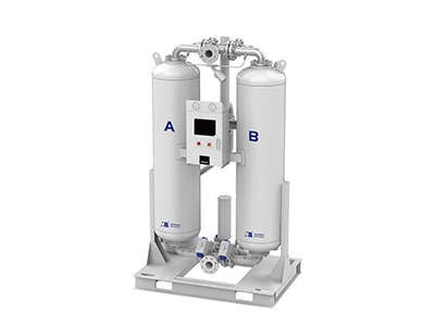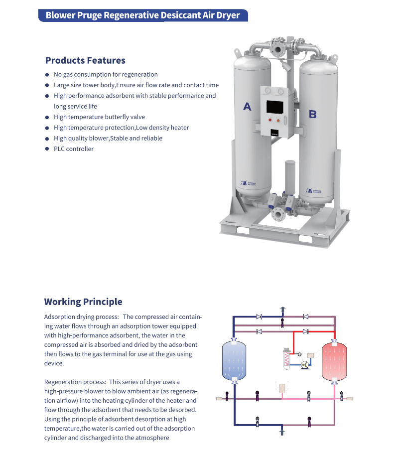 high-pressure blower to blow ambient air (as regenera-tion airflow)into the heating cylinder of the heater andflow through the adsorbent that needs to be desorbed.Using the principle of adsorbent desorption at hightemperature,the water is carried out of the adsorptioncylinder and discharged into the atmosphere