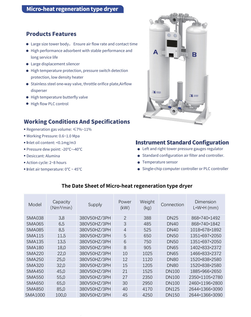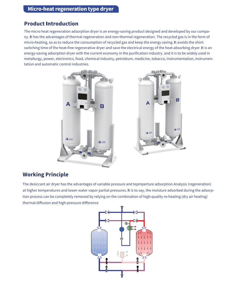 The micro heat regeneration adsorption dryer is an energy-saving product designed and developed by our compa-ny.It has the advantages of thermal regeneration and non-thermal regeneration.The recycled gas is in the form ofmicro-heating,so as to reduce the consumption of recycled gas and keep the energy saving.It avoids the shortswitching time of the heat-free regenerative dryer and save the electrical energy of the heat-absorbing dryer.It is anenergy-saving adsorption dryer with the current economy in the purification industry.and it is to be widely used inmetallurgy,power,electronics,food,chemical industry,petroleum,medicine,tobacco,instrumentation,instrumen-tation and automatic control industries.