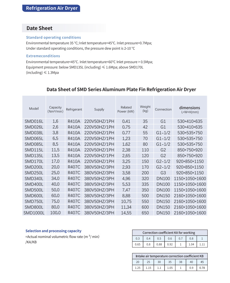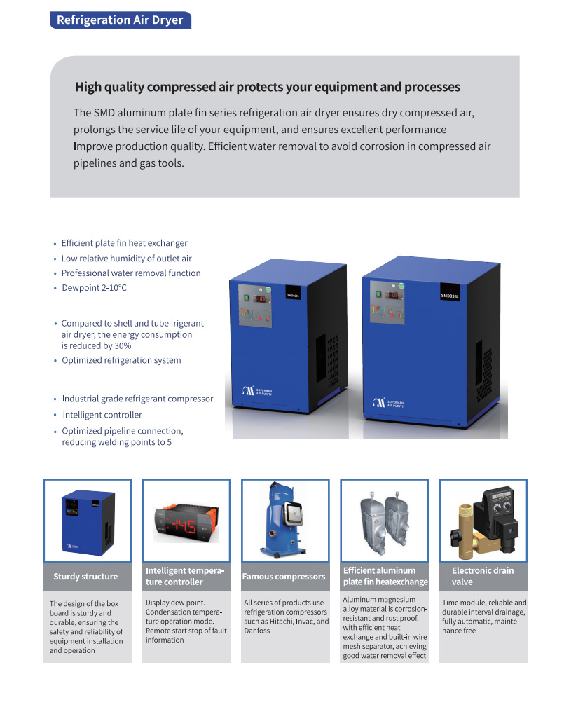 The SMD aluminum plate fin series refrigeration air dryer ensures dry compressed air,prolongs the service life of your equipment,and ensures excellent performance